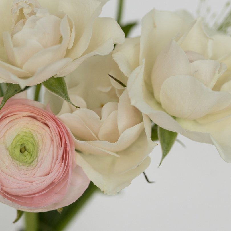 Featuring fresh, seasonal flowers in a white/ivory, blush, and green color palette, this boutonniere for pickup from our Denver studio is created in a stunning, classic design. It's created using one white/ivory focal flower with a touch of blush and light greenery.