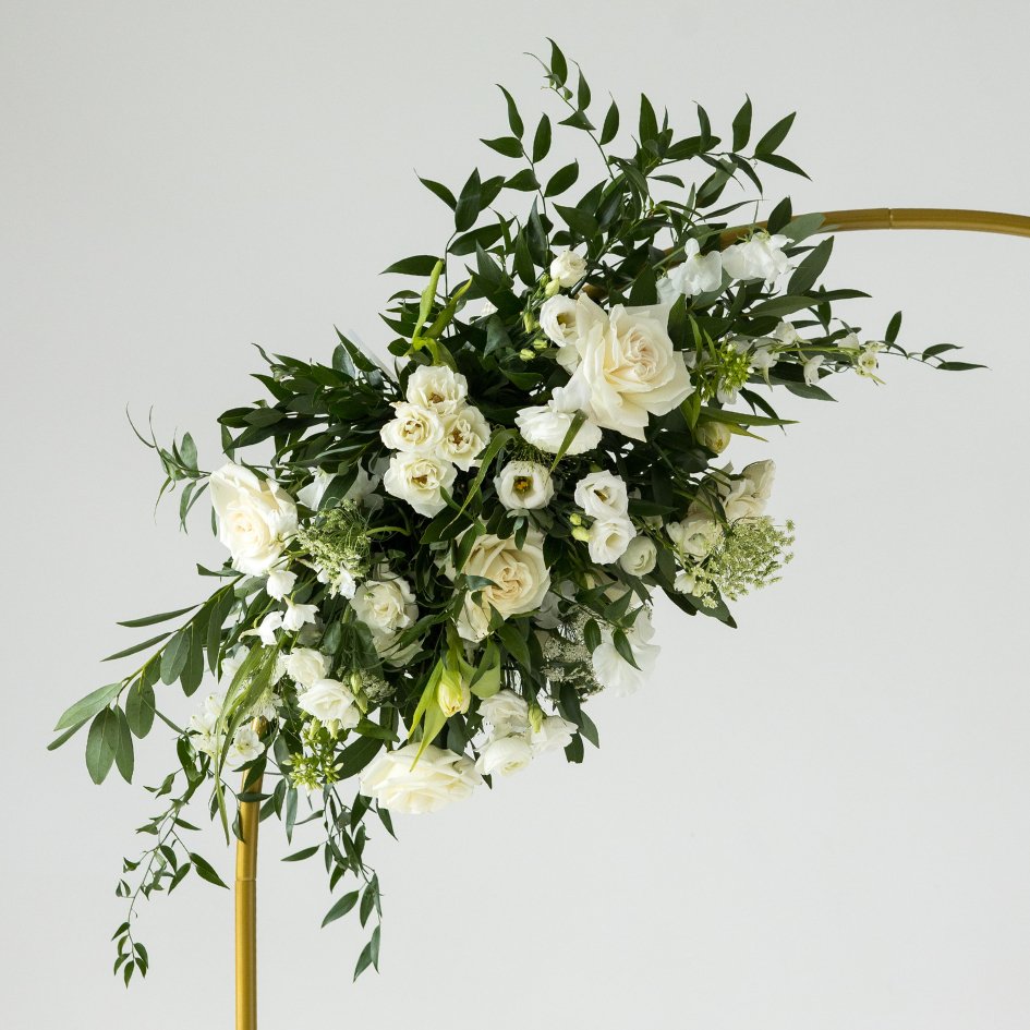 Add a touch of classic beauty to your arch with our Ivory & Green Medium Arch Spray. Featuring a stunning mix of greenery and florals, our sprays are created in vase-less cages and will just need zip ties that can be easily cut off after, to attach to most arches. Once your order is placed, we'll reach out with full instructions on how to attach the spray to any arch yourself.