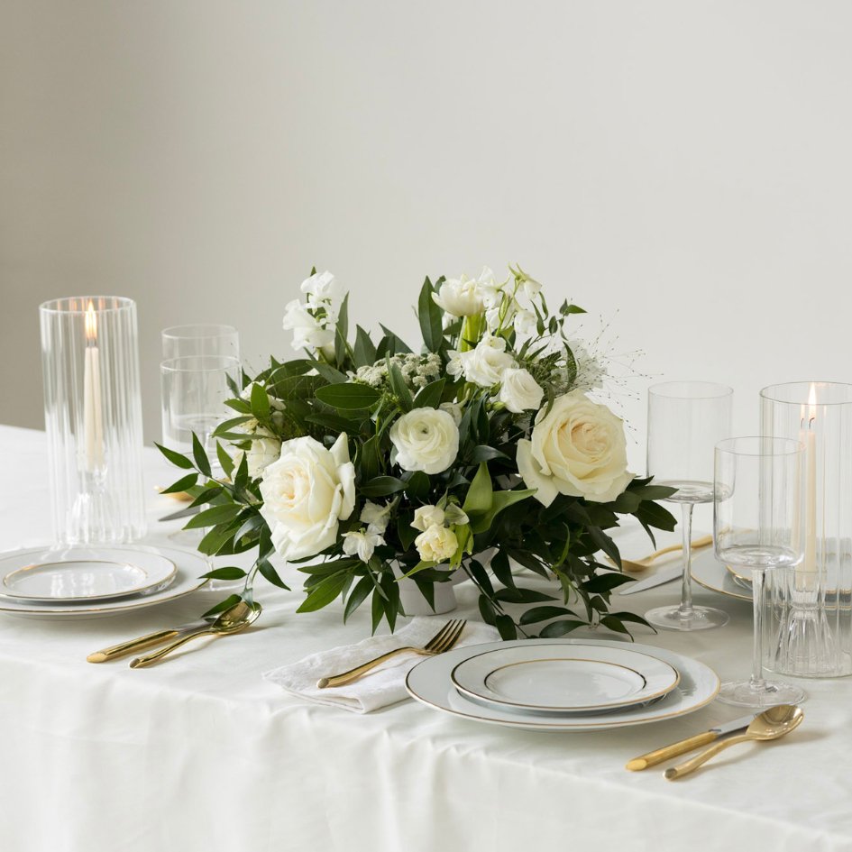 Our small Ivory & Green arrangements feature a mix of stunning florals and lush greenery. This size and style works perfectly for a dinner table small centerpiece, bar arrangement, or guestbook/welcome table.