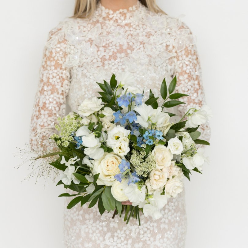 Featuring fresh, seasonal flowers in a white, ivory, green, and blue color palette, this 10-12" Bridal Bouquet for pickup from our Denver studio is created in a stunning, classic design. Flowers may include but are not limited to roses, ranunculus, peonies, various foliages and greenery.