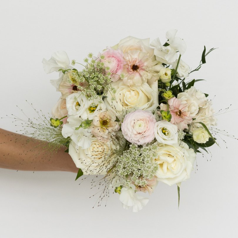 Featuring fresh, seasonal flowers in a white, ivory, blush, and green color palette, this 10-12" Bridal Bouquet for pickup from our Denver studio is created in a stunning, classic design. Flowers may include but are not limited to roses, ranunculus, peonies, various foliages and greenery.