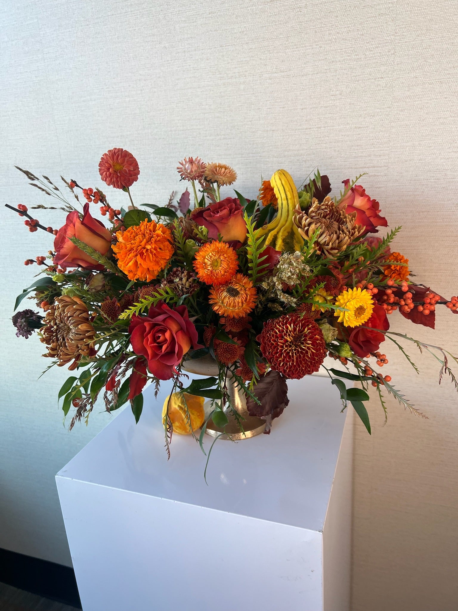 Make your table extra warm and welcoming with our Fall Elegance arrangement, a fresh floral centerpiece. Crafted with fresh, seasonal varieties, this fall arrangement warms up any space. Perfect as a dining table centerpiece or a beautiful gift, our handcrafted arrangement has us feeling fall.