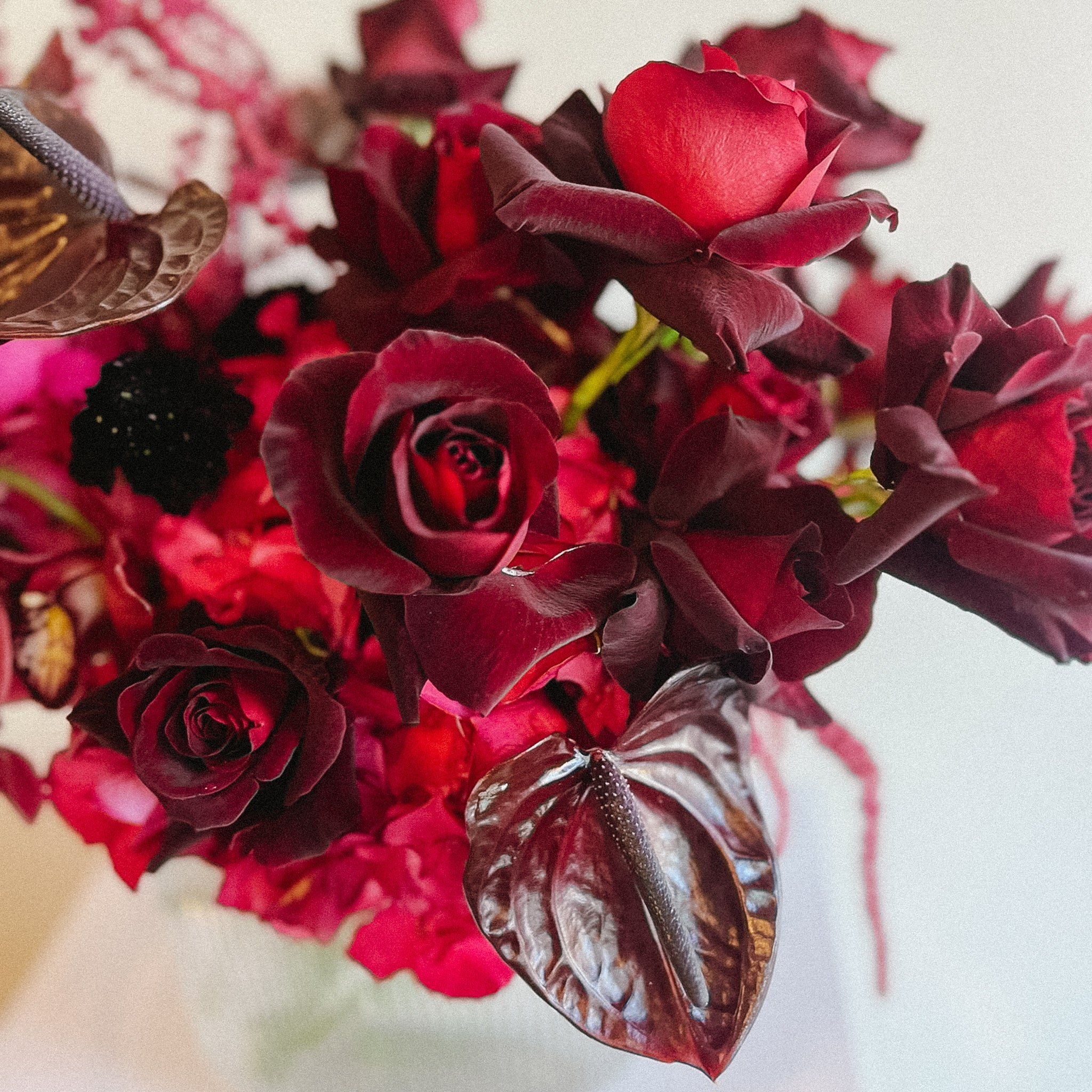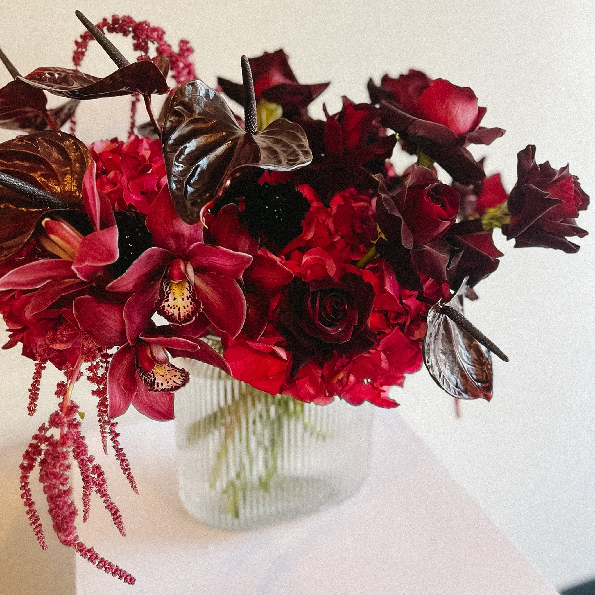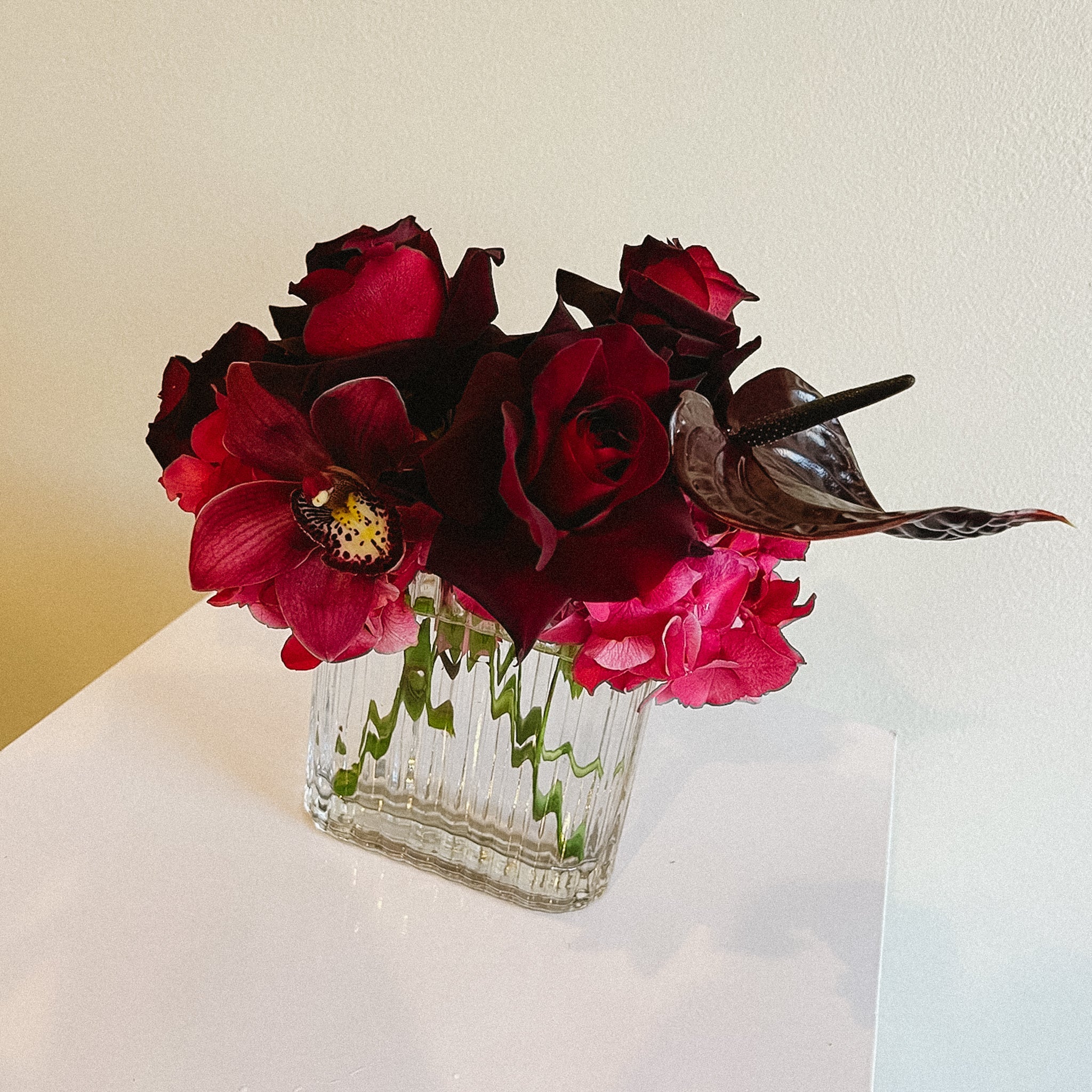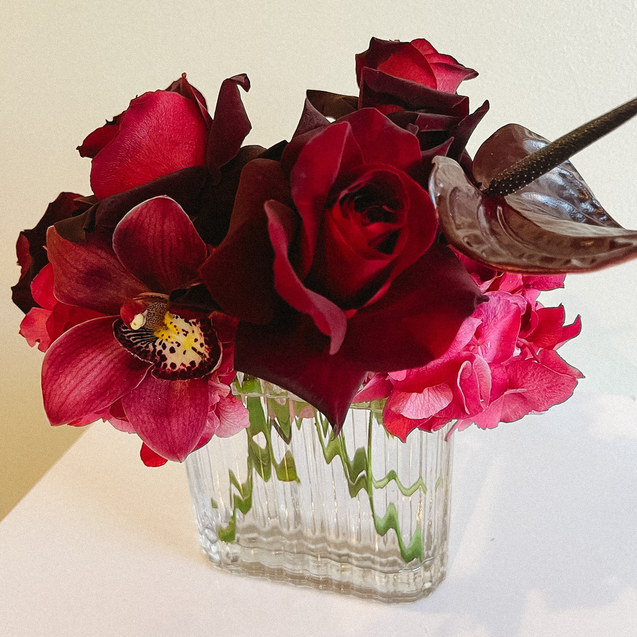 Bold, dramatic, and unapologetically romantic—the Bleeding Love arrangement is a statement of passion and allure. Deep crimson roses, striking burgundy anthuriums, and rich magenta orchids come together in modern glass vase to create a captivating display. This moody, sophisticated arrangement is perfect for making a powerful impression and celebrating love in its most intense form.