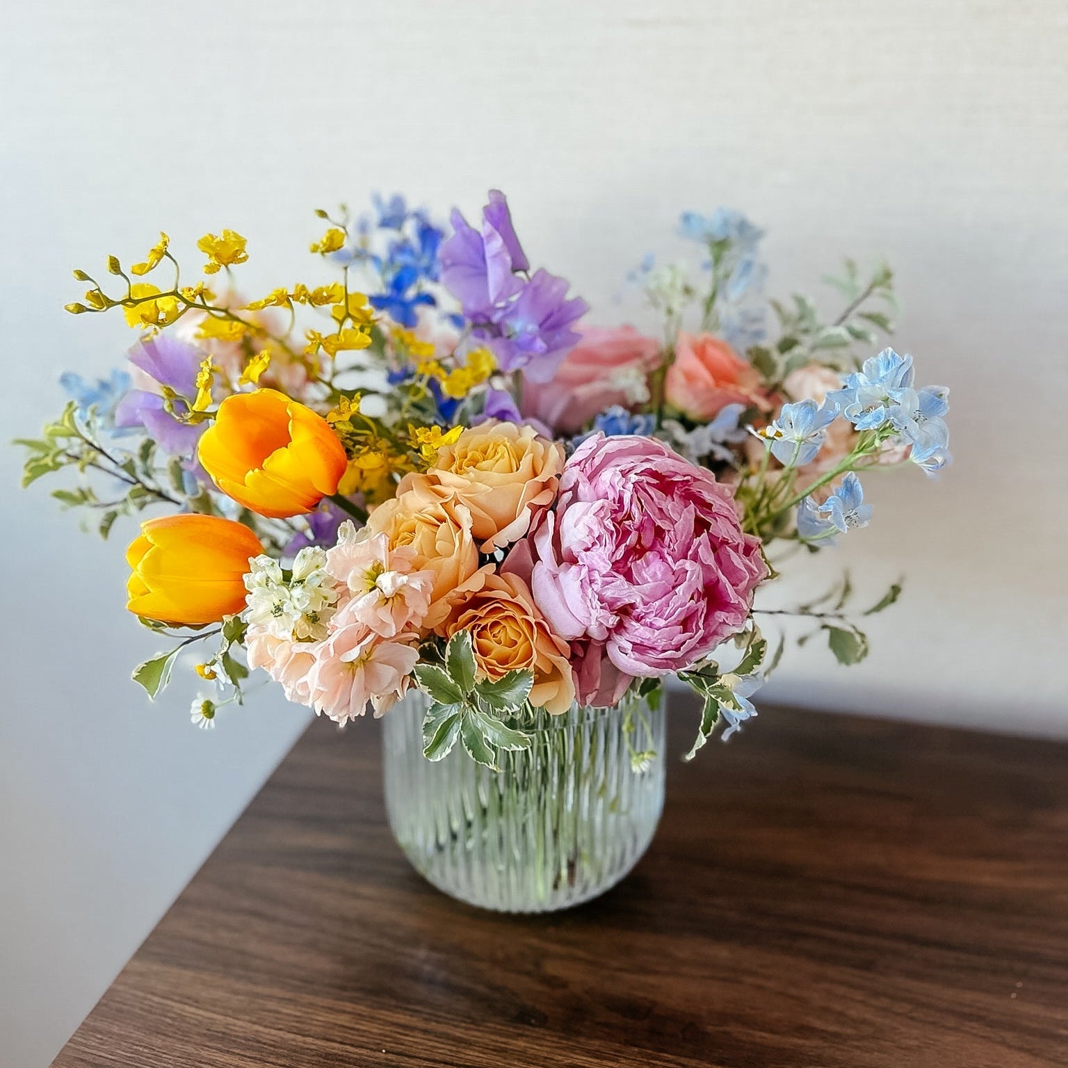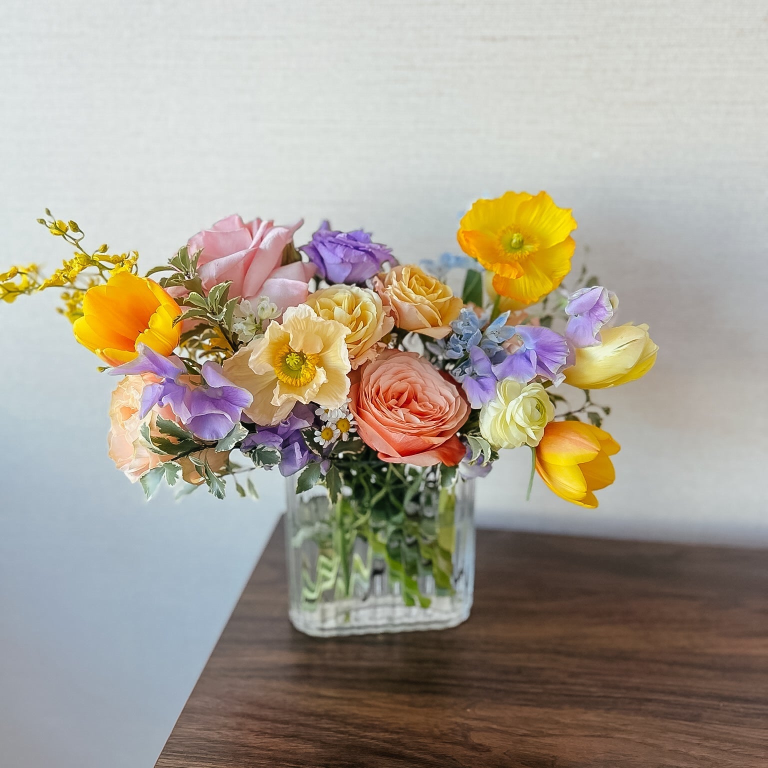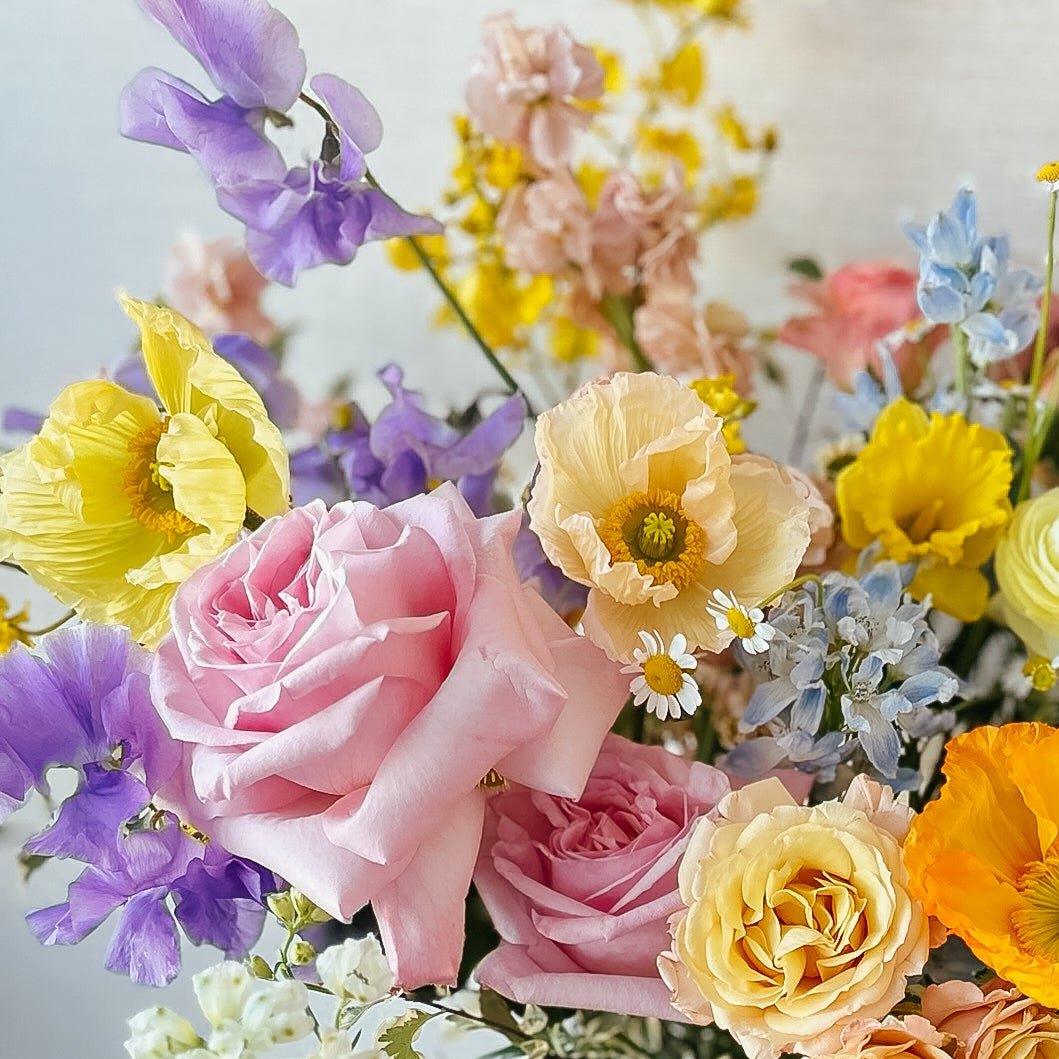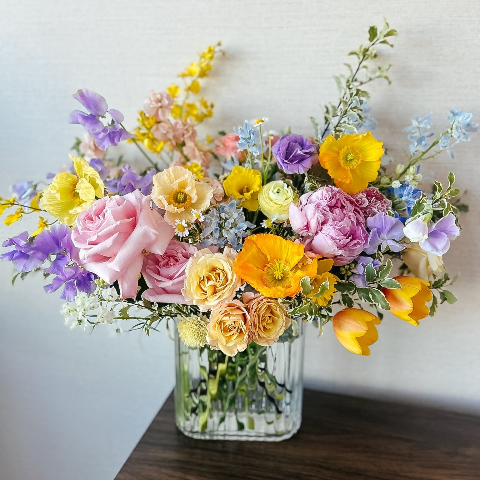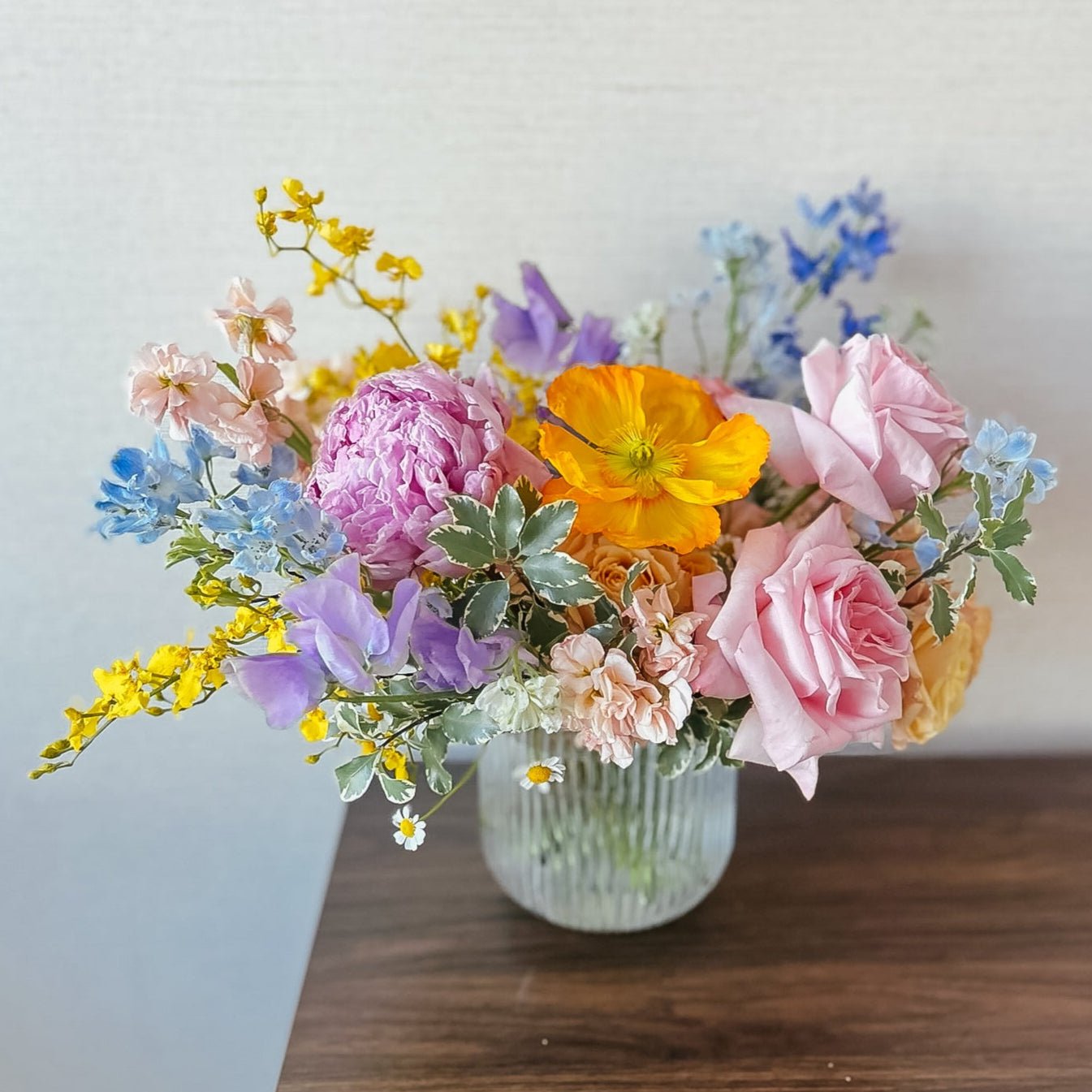A burst of pastel color, a breath of fresh air—Daydream captures the magic of golden light after a soft spring rain. Blush roses, sunny poppies, ruffled peonies, and delicate delphinium create a playful yet refined mix of pastels and brights. Hints of lavender, buttery yellow, and soft peach add warmth and movement, making this arrangement feel like a dreamscape in bloom.