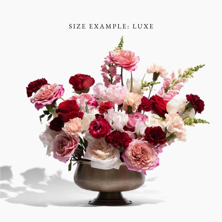 - Luxe: When you want to make a statement or make the recipient feel extra special. A good size for an entryway table, bar, or buffet, but is likely too tall to serve as a centerpiece.