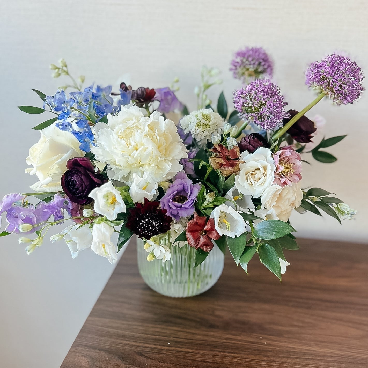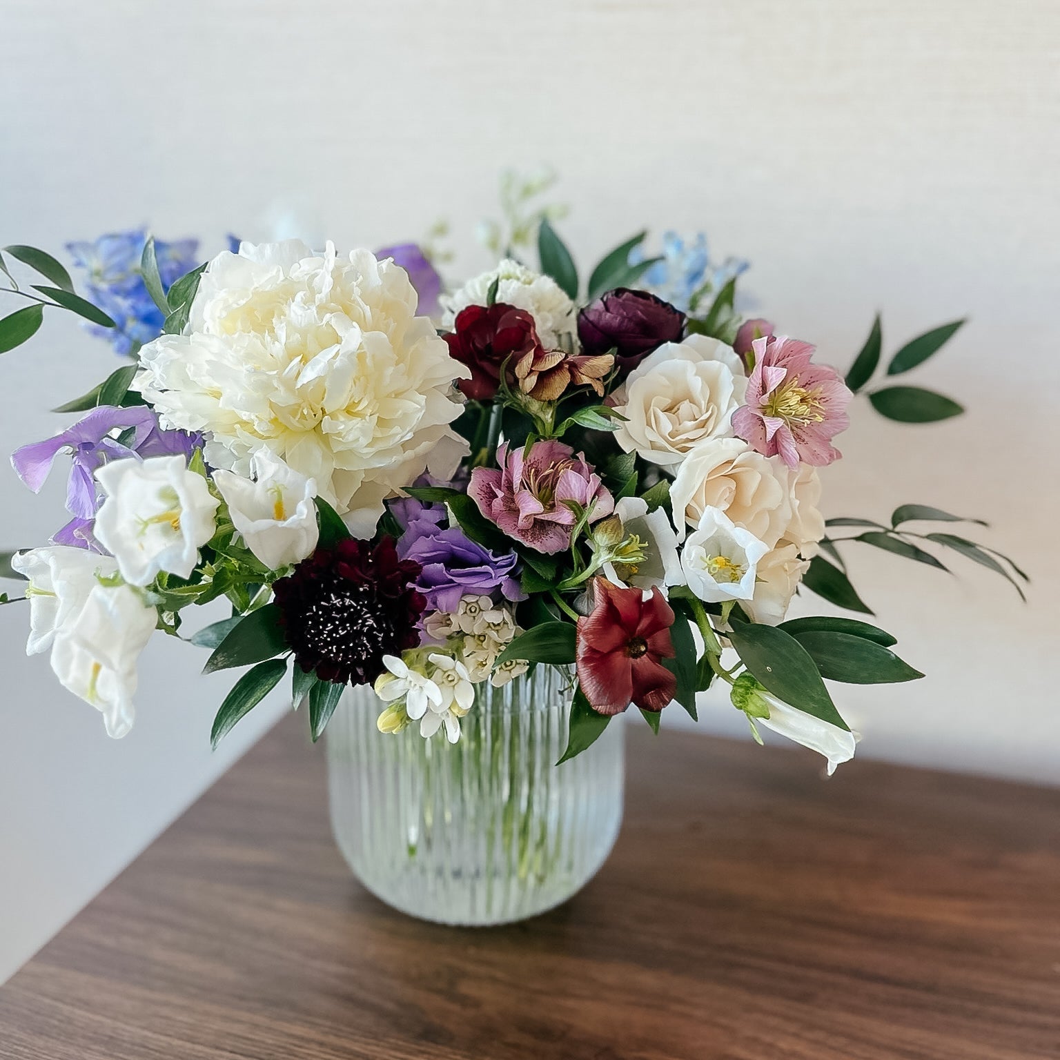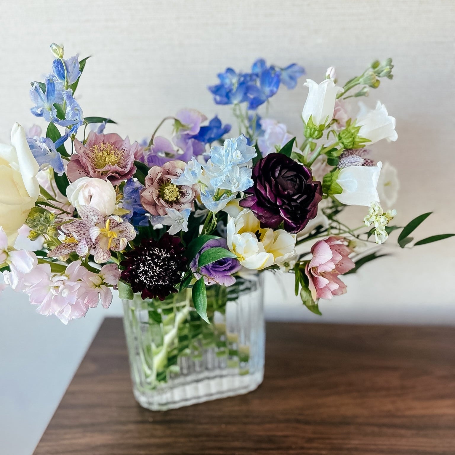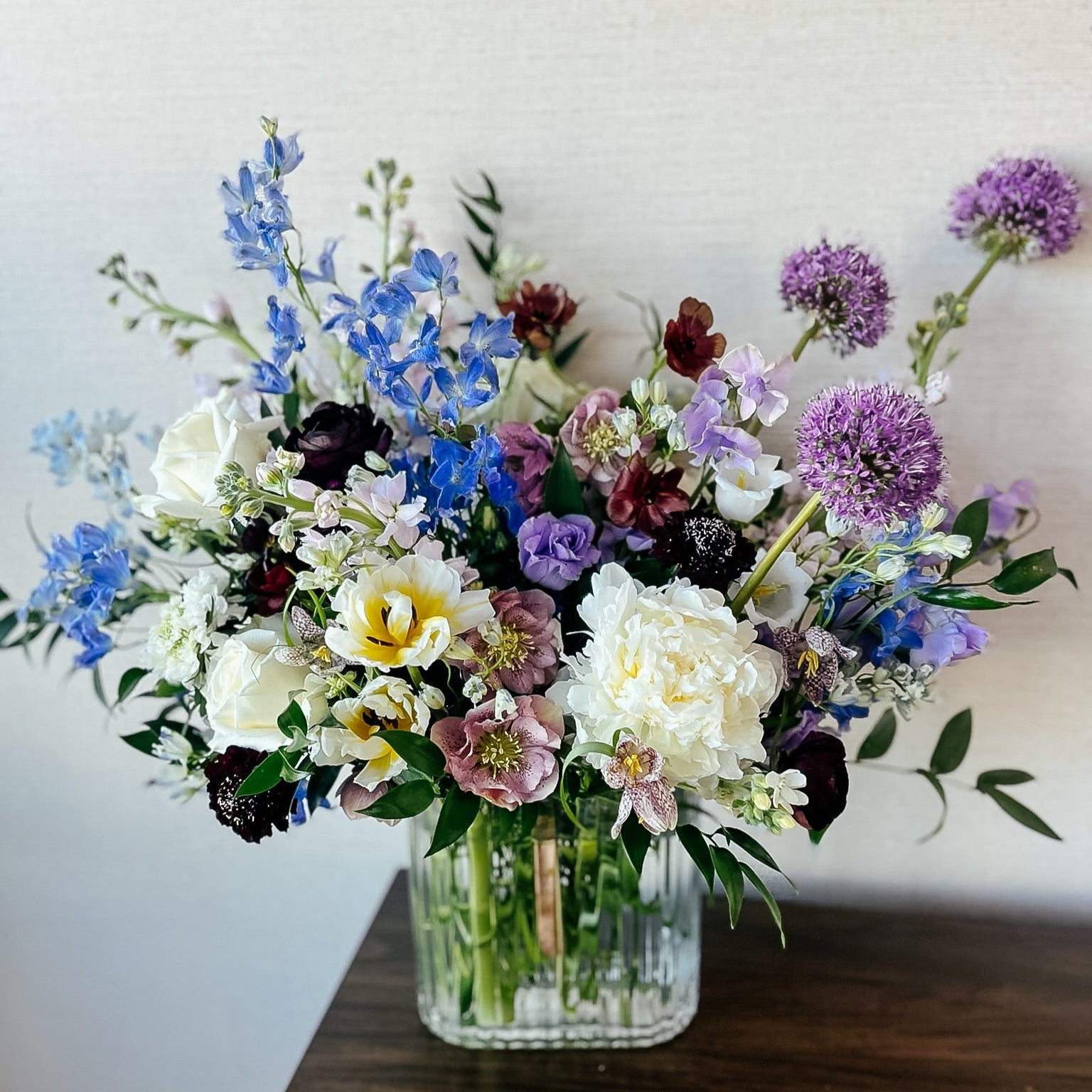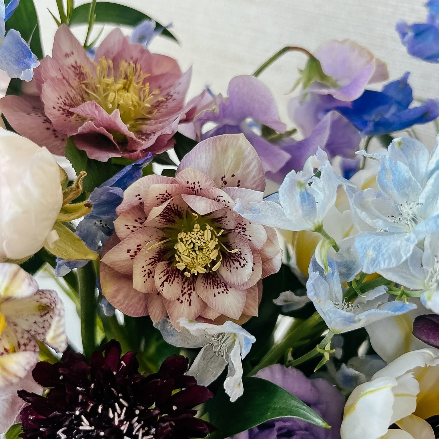 A little wild, a little otherworldly—Moon Water is a mesmerizing mix of moody hues and soft, luminous textures. Delicate blue delphinium, creamy peonies, and buttery narcissus are intertwined with deep burgundy ranunculus, striking allium, and rare hellebores, creating a rich interplay of color and form. Wisps of greenery and textural elements add movement, making this arrangement feel like a spellbinding moment frozen in time.