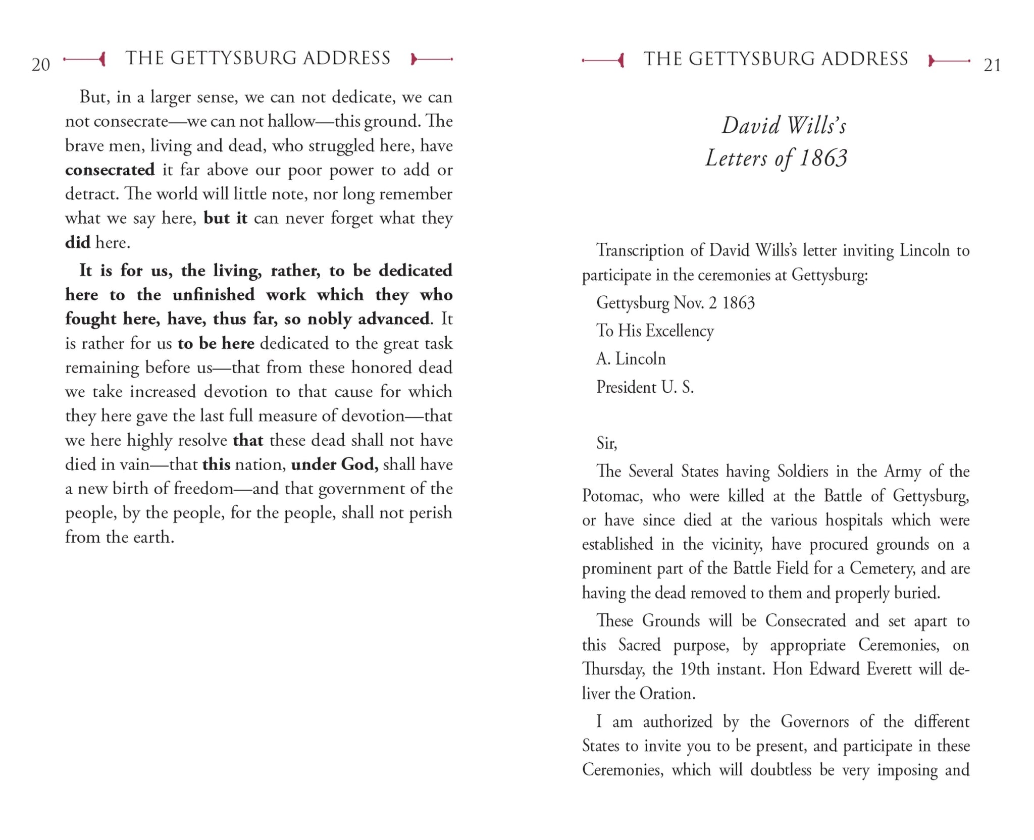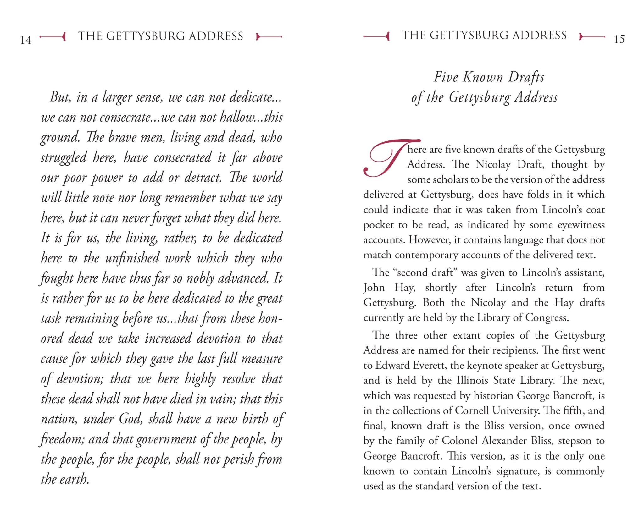 A Pocket-Sized Hardcover Edition of Abraham Lincoln's Gettysburg Address. The Gettysburg Address was delivered on the afternoon of November 19, 1863 by Abraham Lincoln at the dedication of the battlefield of the Civil War's bloodiest battle. Included in this edition is the Bliss text of the address, contemporary reactions, and other important documents relating to this moving speech by one of America's most beloved Presidents. Hardcover.