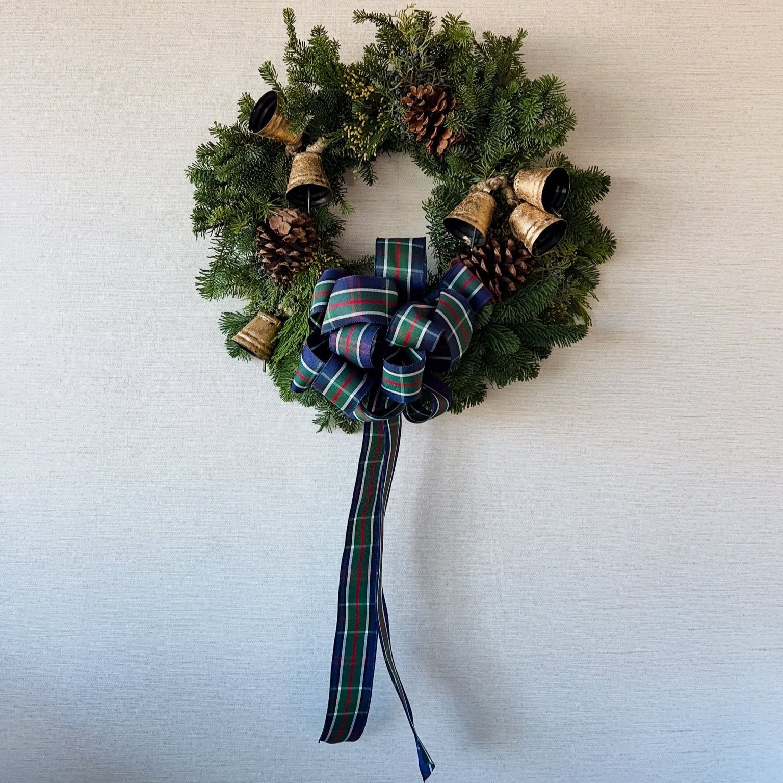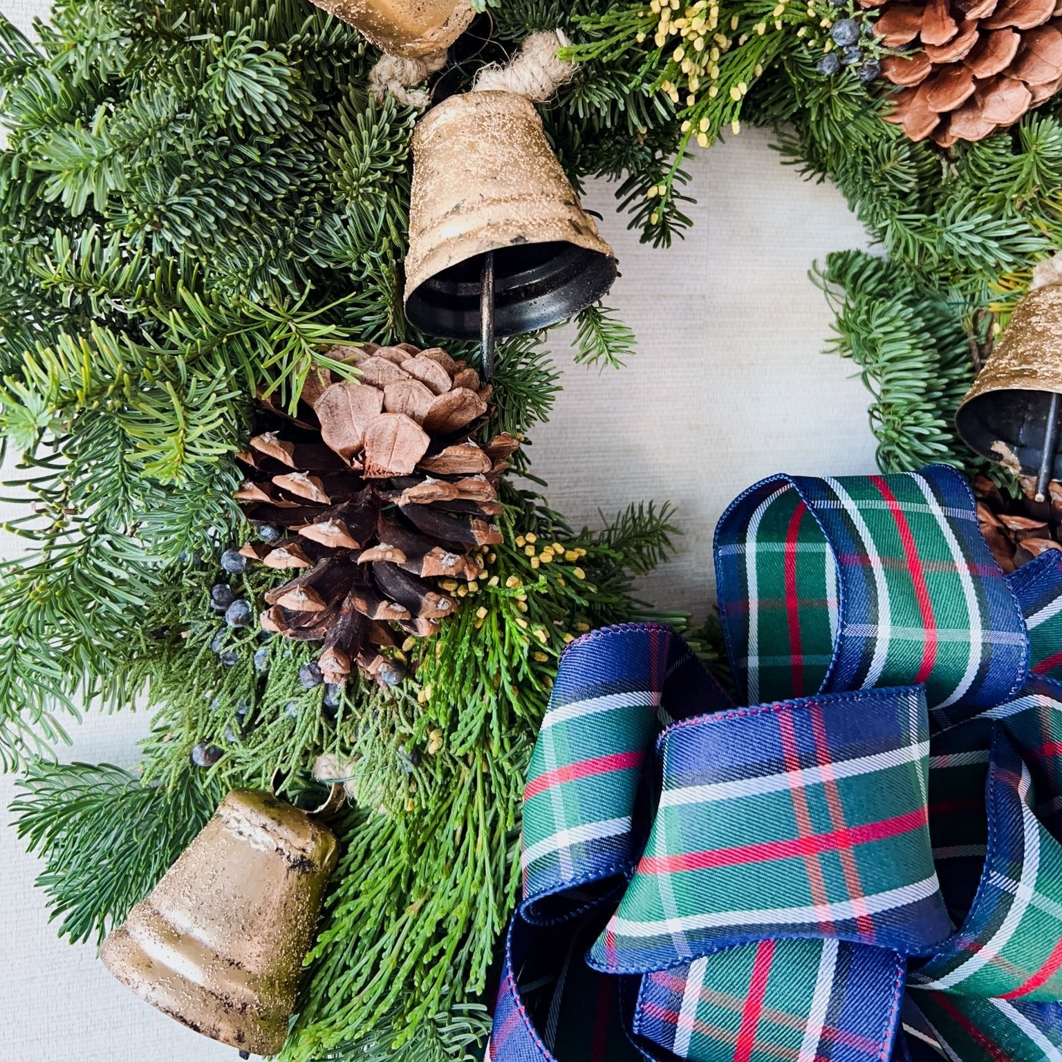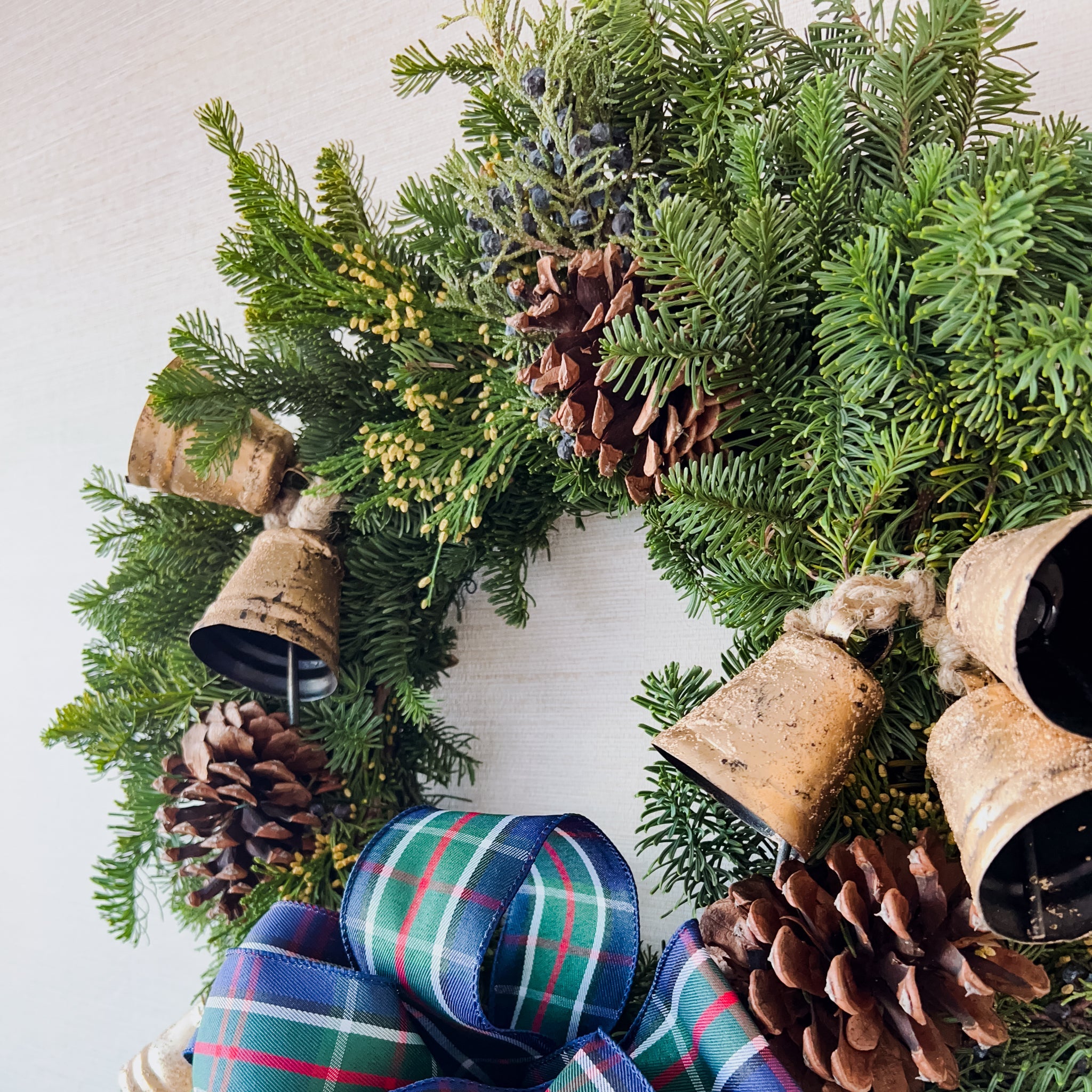 The Teddy wreath brings a cozy and elegant look to wherever it's hung. Made with fresh premium greenery, an oversized plaid bow, and charming vintage-style bells, the Teddy wreath is designed to bring sophisticated charm and a welcoming feel to your holiday home.
