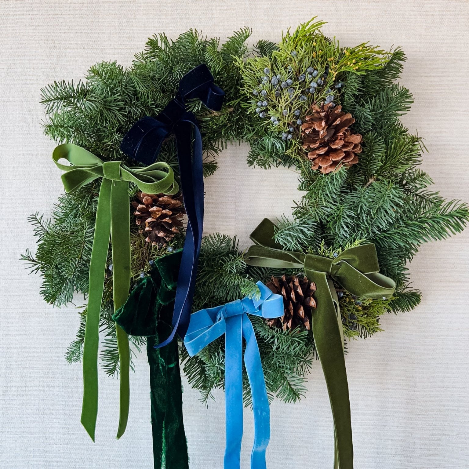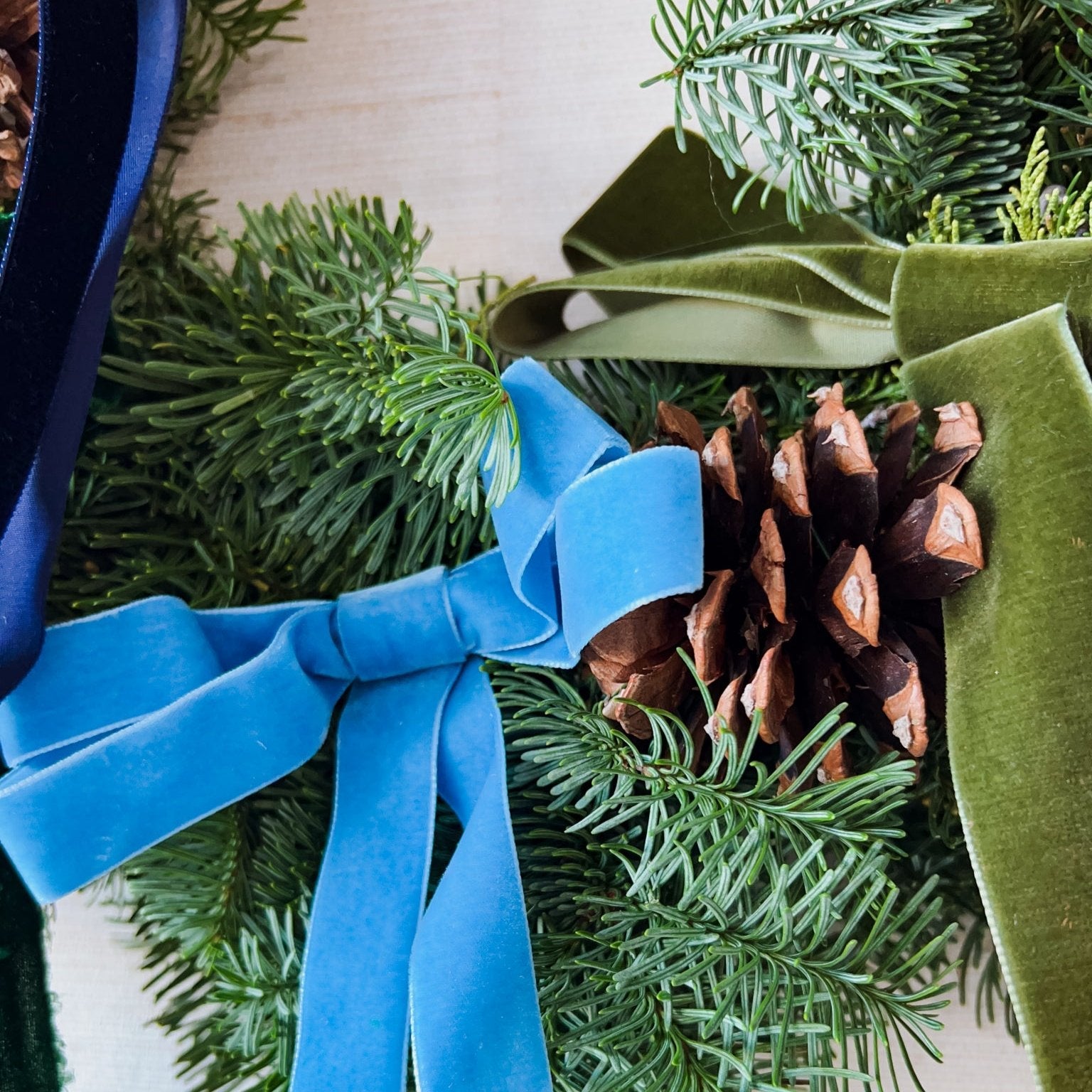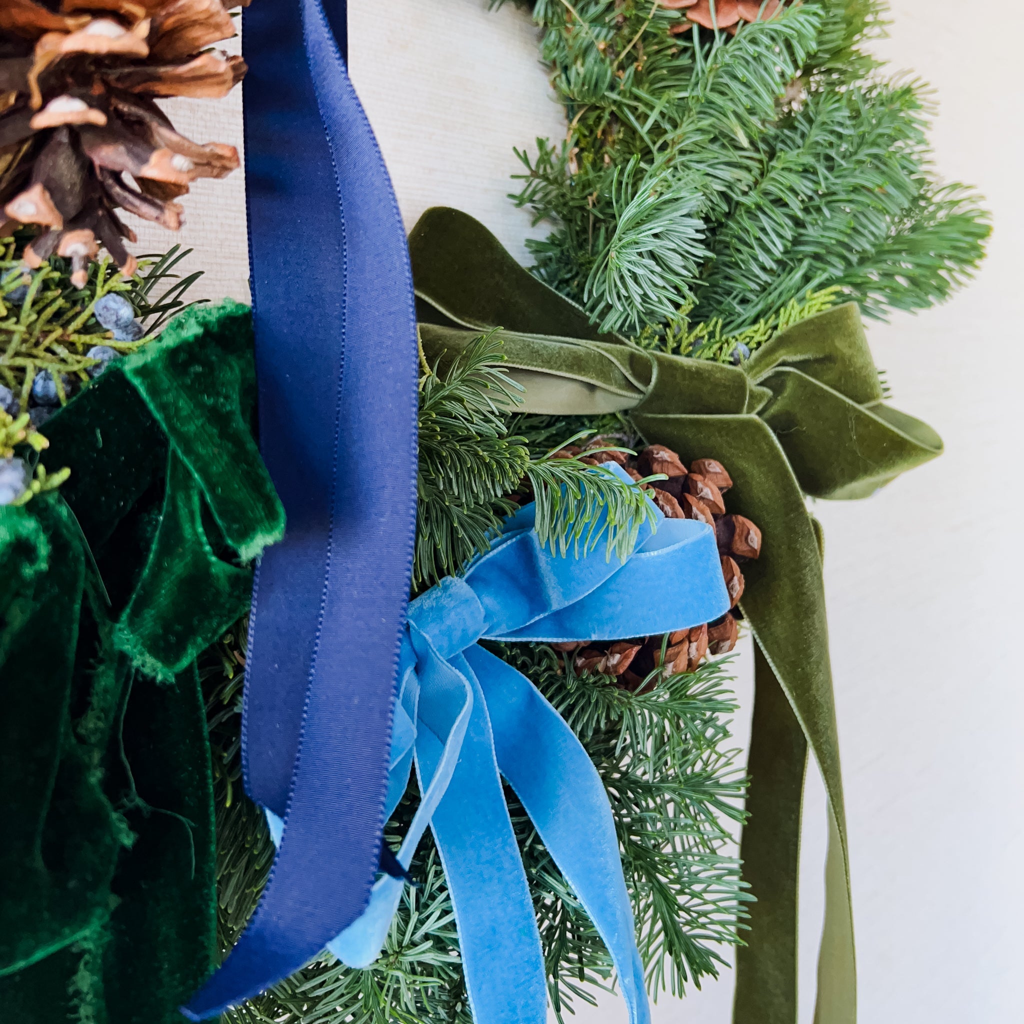 Add a little holiday whimsy to your home with this Whimsical Wonder wreath. Made with fresh premium greenery and a mix of blue and green high-quality velvet ribbons, each wreath is designed to bring festive charm and a welcoming feel to your holiday home.