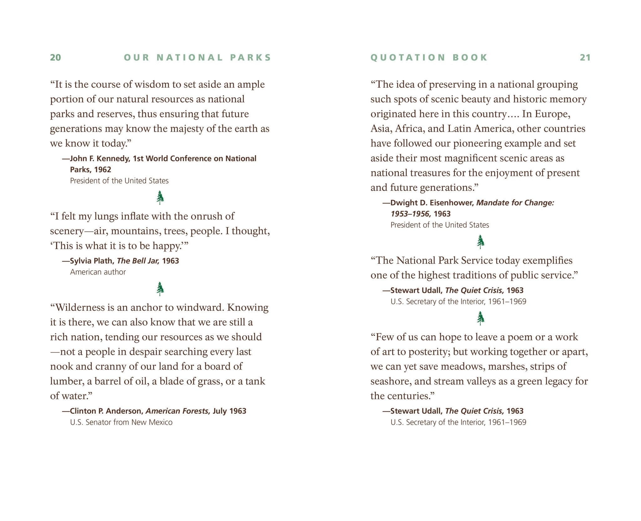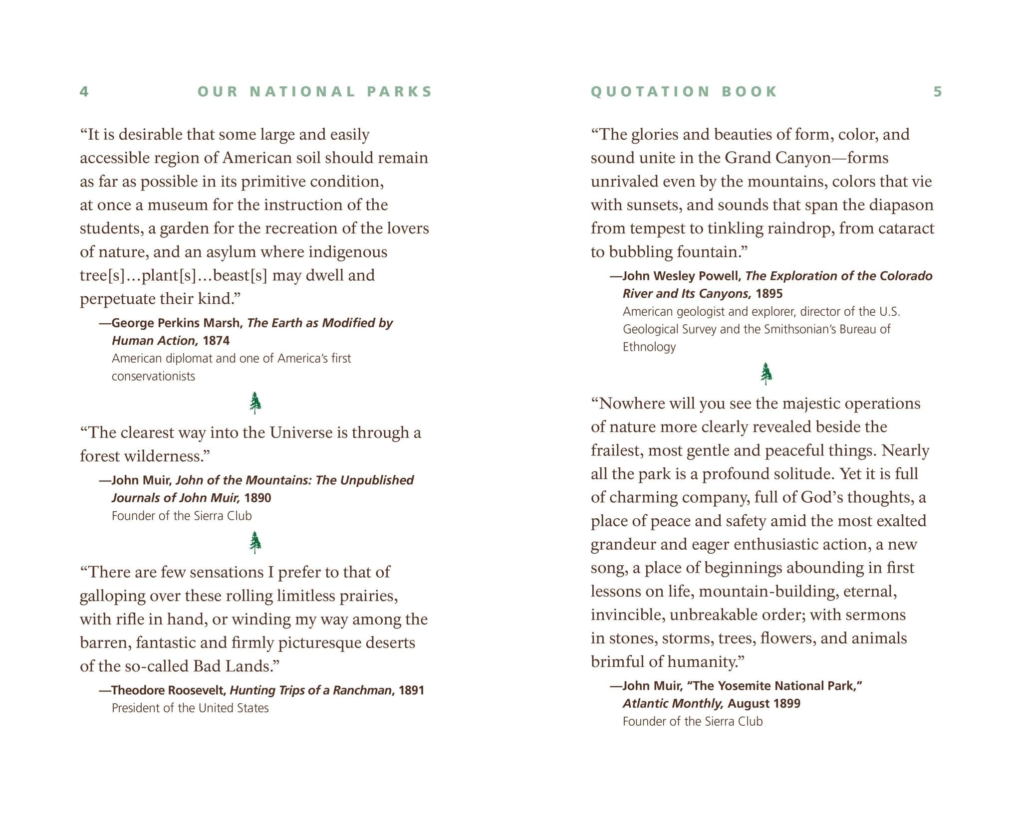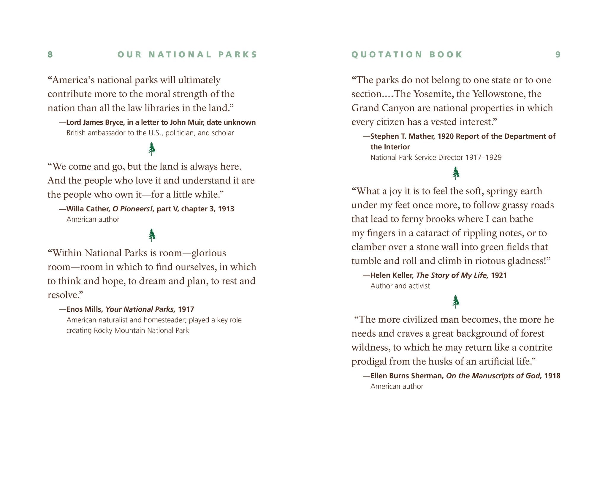 Applewood Books celebrates our country's national parks with this inspiring collection of quotations about "America's best idea," presented in a handsome hardcover keepsake edition. Included are quotes from some of the exceptional people — Theodore Roosevelt, John Muir, Margaret "Mardy" Murie, Stephen Mather, and more — who were instrumental in preserving our precious geographic and historic treasures for all to enjoy.