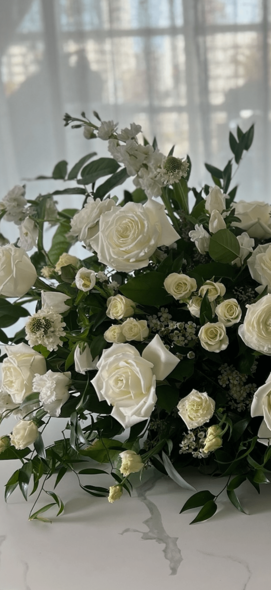 Our casket spray is a lush, white and green arrangement designed to make an impact. A refined mix of premium blooms like garden roses, ranunculus, spray roses, and lisianthus is paired with delicate hellebores and fresh greenery, creating a look that’s both polished and compassionate. Our casket spray is the perfect way to honor a loved one as they make their way to a new adventure.