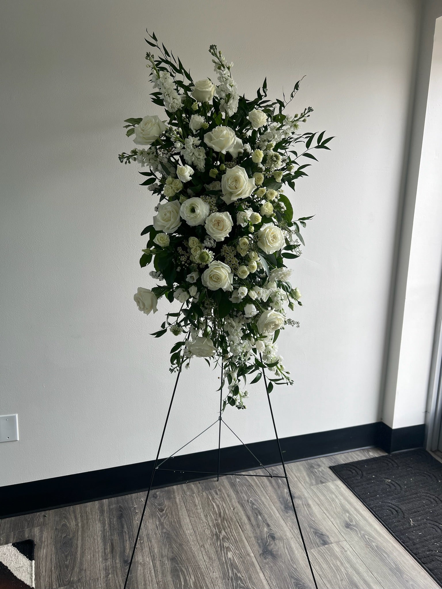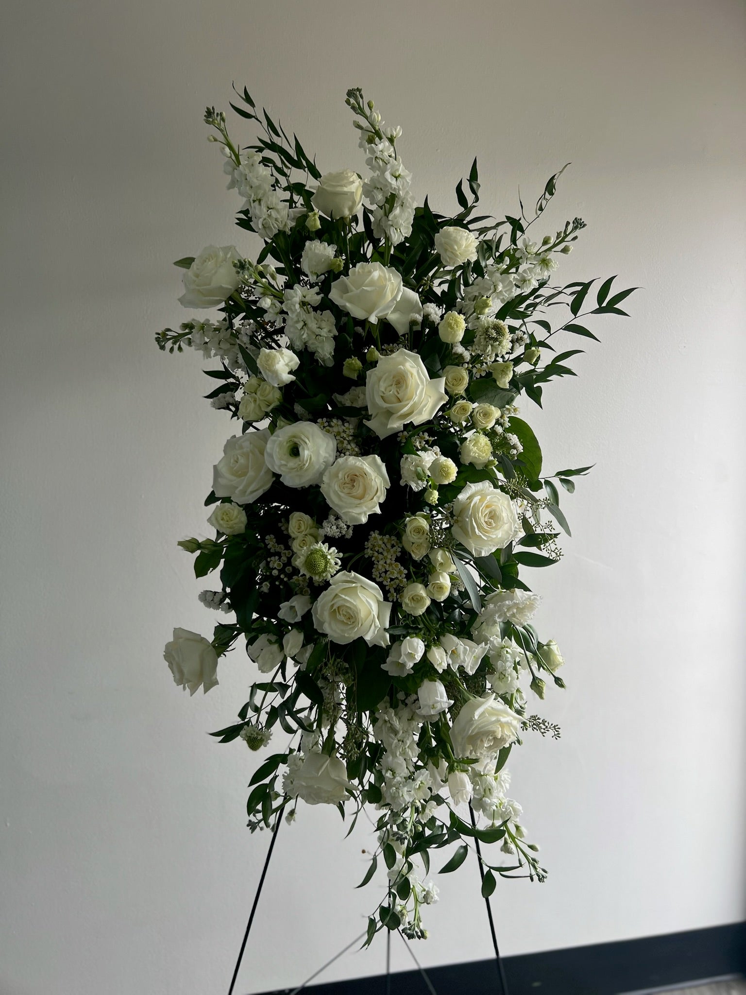 Our funeral spray with stand is a lush, white and green arrangement designed to make an impact. A refined mix of premium blooms like garden roses, ranunculus, spray roses, and lisianthus is paired with delicate hellebores and fresh greenery, creating a look that’s both polished and compassionate. Our standing funeral spray is the perfect way to honor a loved one as they make their way to a new adventure.