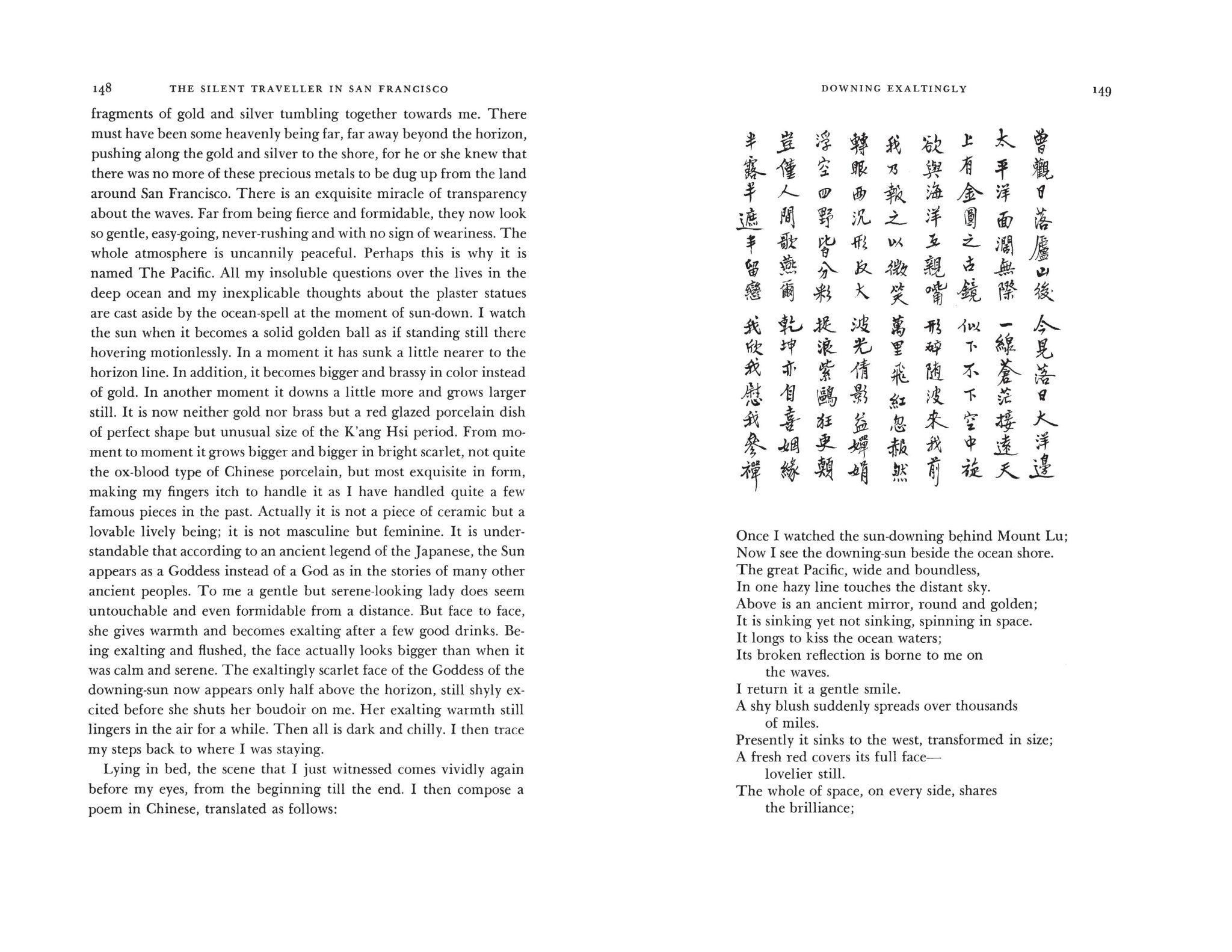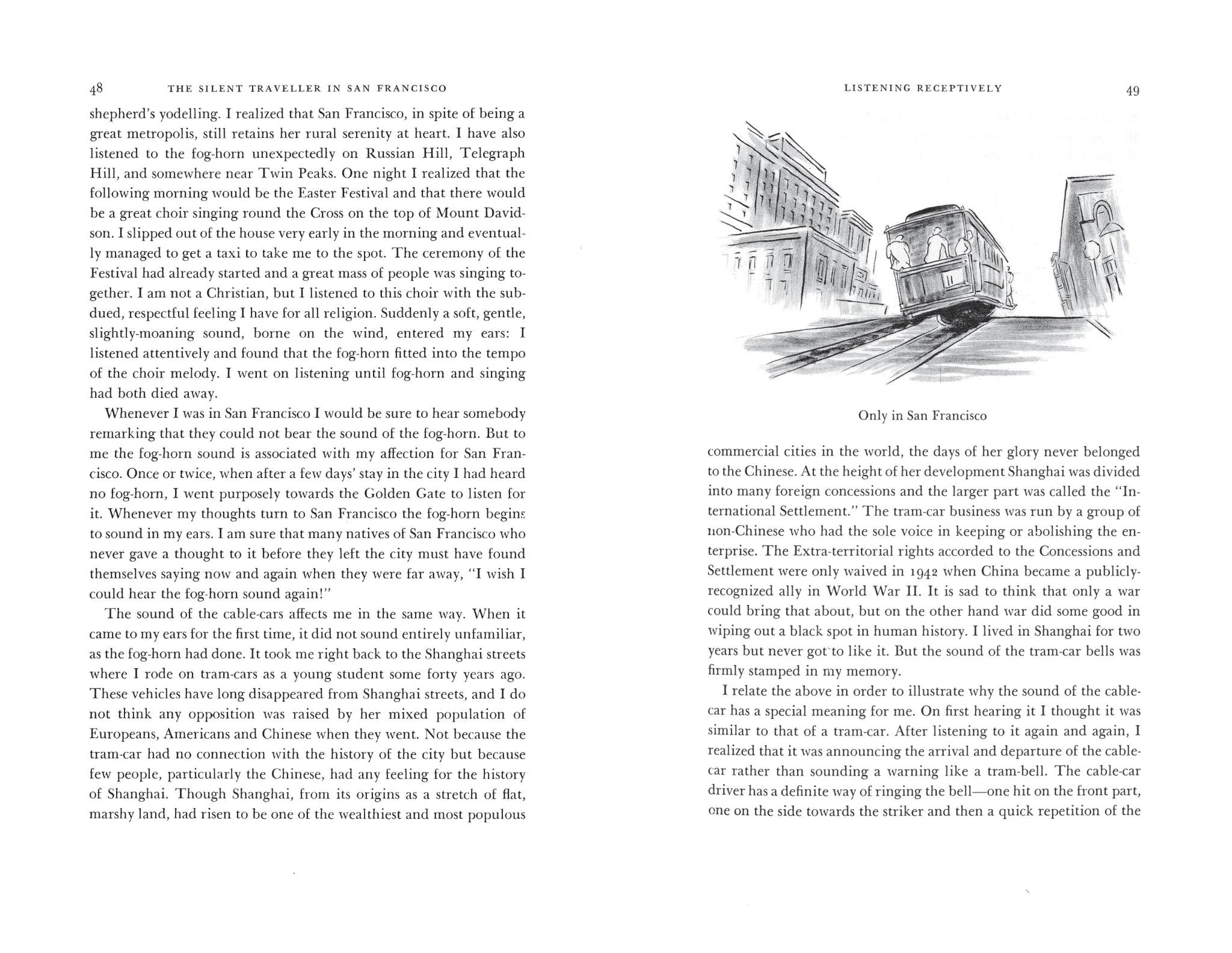 Distinguished author, artist, calligrapher, and poet Chiang Yee wrote and illustrated a dozen “Silent Traveller” books, from 1937-1972. The last to focus on an American city, The Silent Traveller in San Francisco was originally published in 1964. The book reveals Yee's special affection for a city whose fog-draped hills and winding streets recall for him the poetic beauty and mystery of his much loved Chinese landscape. From Market Street to the Golden Gate Bridge, Fisherman’s Wharf to Telegraph Hill, Chinatown to Berkeley, Oakland, and the Napa Valley, Yee always charms the reader with his quizzical, quiet observations which fuse the old with the new, the historical with the present.